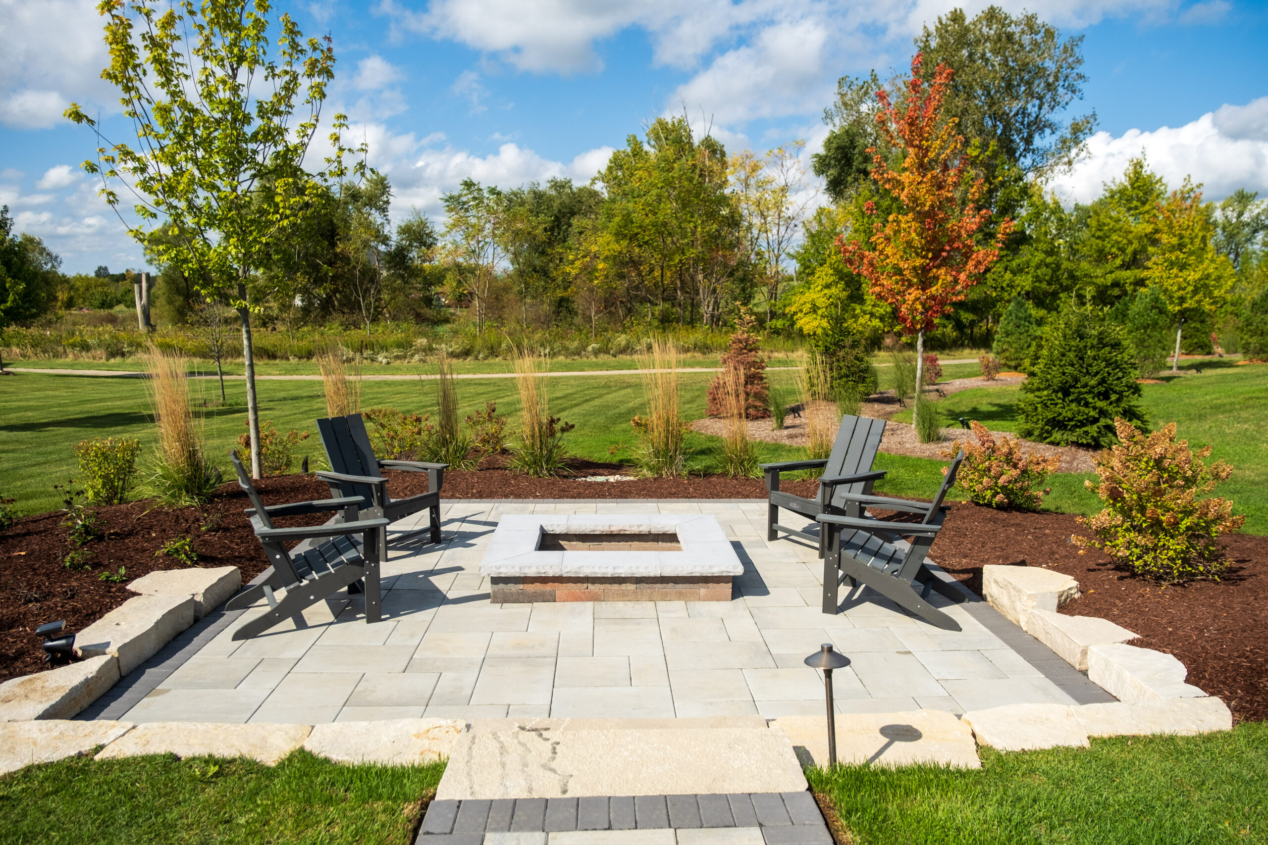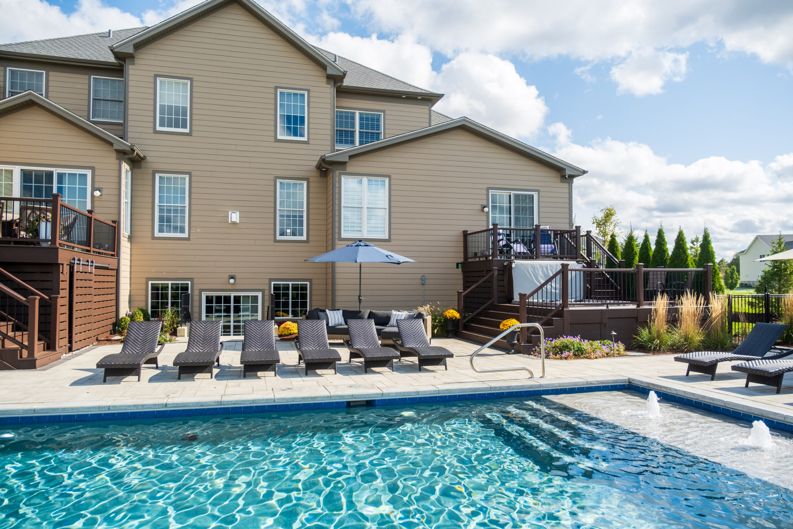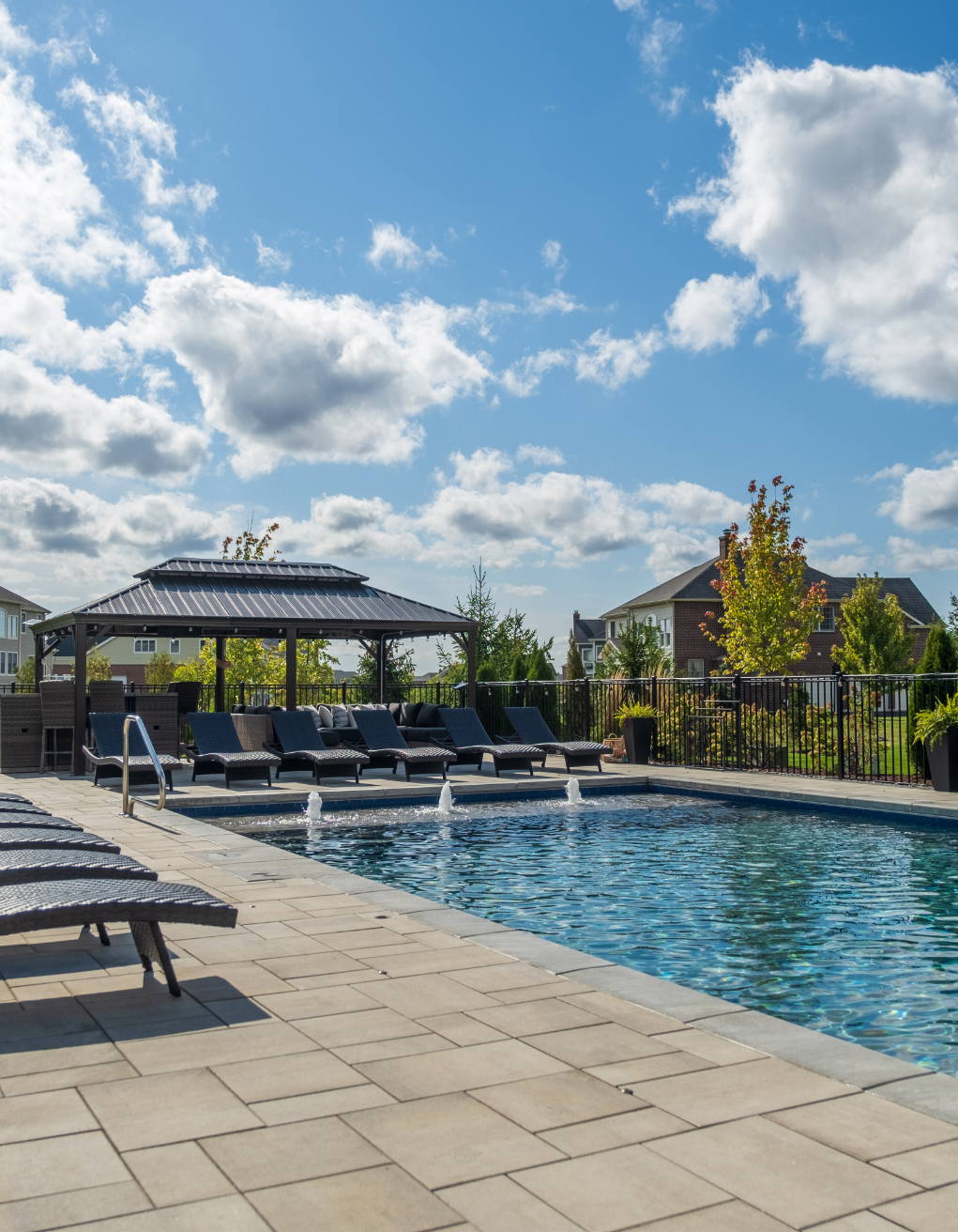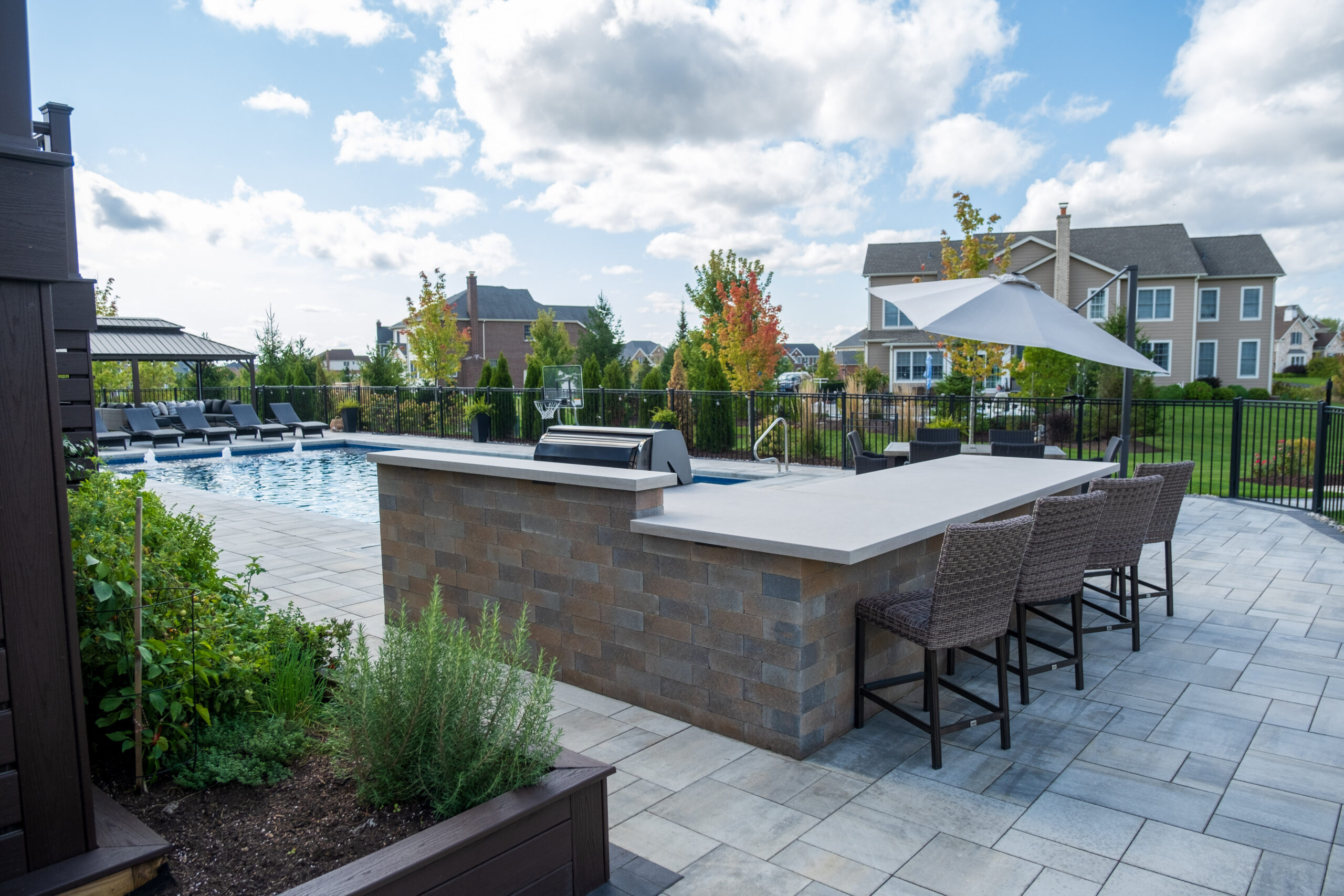 The sleek pool deck, built with Unilock pavers, sets the stage for sun-soaked lounging and summer fun. Just steps away, an open-air pavilion and fully equipped outdoor kitchen make it easy to cook, gather, and celebrate. From relaxed afternoons to lively evenings under the lights, this space was designed for living, entertaining, and making memories.
